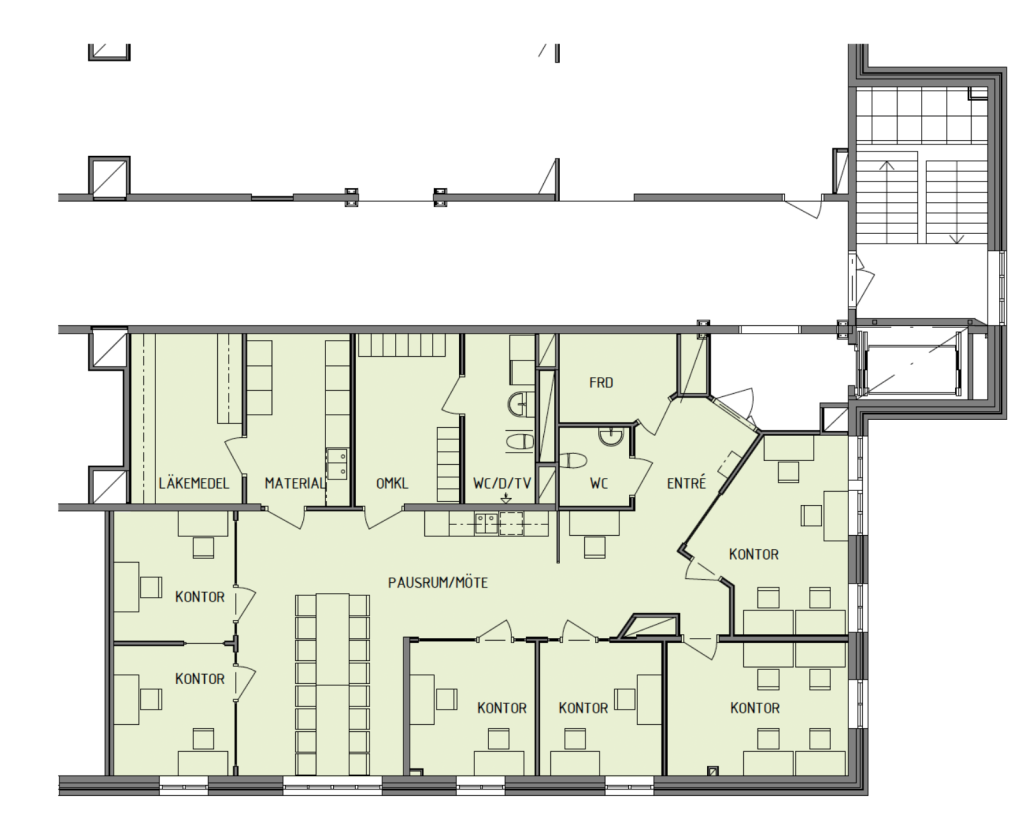 Lokalen renoverades år 2017, är ljus och trivsam. Med en yta på 177 kvm och flera rum passar denna lokal perfekt både som företagslokal med flera kontorsrum, vårdmottagning med mottagningsrum, hälsostation eller co-working space.